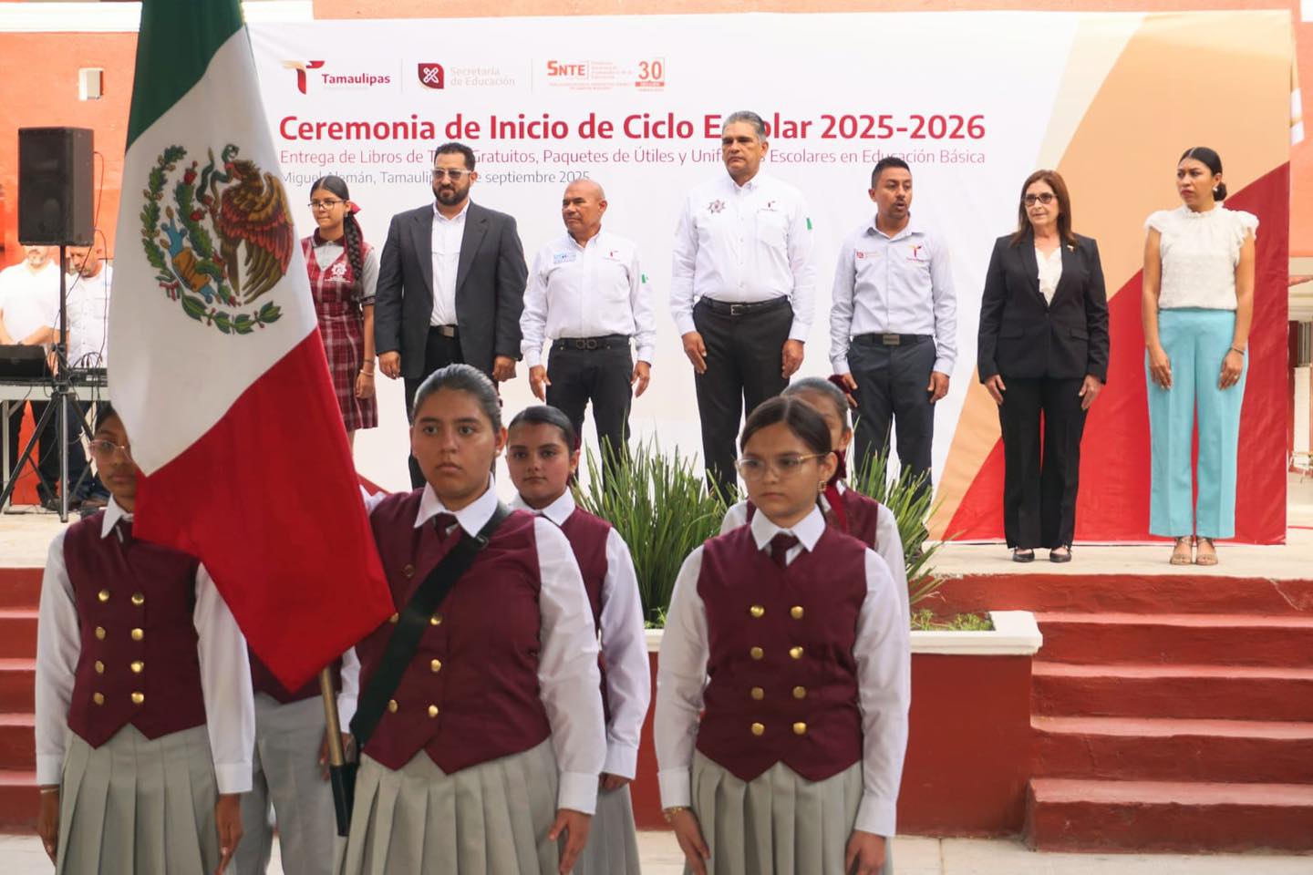 El Presidente Municipal Biol. Ramiro Cortez Barrera, acompañado del secretario de Seguridad Pública en Tamaulipas, Gral. Carlos Pancardo Escudero, encabeza la ceremonia de Inicio del Ciclo Escolar 2025-2026 en la Escuela Secundaria Técnica No 49 “Wilfrido Massieu”.