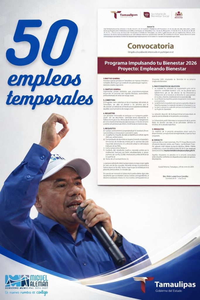 La gestión de un nuevo Programa de Empleos Temporales “Impulsando tu Bienestar” realizada por el Biol. Ramiro Cortez Barrera ante el Gobernador del Estado, Dr. Américo Villarreal Anaya, ha sido aprobada para beneficiar a aquellas personas que no tienen un ingreso formal, fortaleciendo a la vez los trabajos de limpieza de áreas públicas.